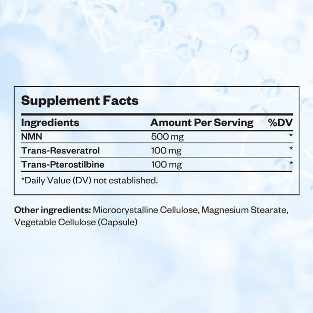 The formula combines NMN with Resveratrol and Pterostilbene, ingredients widely associated with NAD+ metabolism and cellular aging research, making it highly relevant for longevity focused supplement brands.