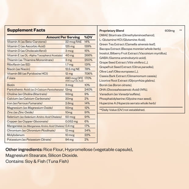 This formulation combines a broad spectrum of Vitamins, Minerals, Amino Acids, and Nootropic Compounds including DMAE, L Glutamine, Green Tea Extract, Bacopa, GABA, Phosphatidylserine, DHA, and Huperzine A. It also includes supportive micronutrients such as B vitamins, Magnesium, Zinc, and Selenium, creating a comprehensive formula designed for cognitive support. The capsule structure is built with standard excipients to ensure consistency and stability.