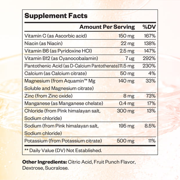 This formulation includes a combination of essential electrolytes such as Sodium, Potassium, Magnesium, and Chloride, along with supportive vitamins like Vitamin C and B-complex nutrients. It is designed to align with hydration-focused products that emphasize endurance, recovery, and daily replenishment.