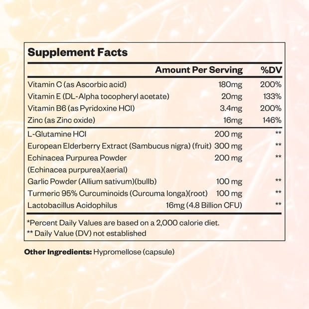 This formulation integrates a combination of essential vitamins such as Vitamin C, Vitamin E, and Vitamin B6 with minerals like Zinc, alongside supportive compounds including L-Glutamine and probiotic elements. It also incorporates botanical components such as Echinacea, Garlic Powder, and Turmeric, creating a layered composition suitable for rapid-response immune positioning.