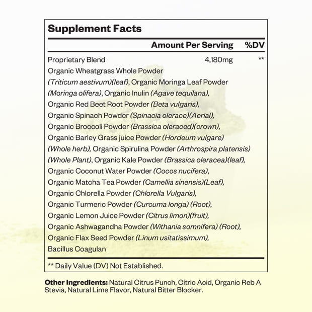 This formulation includes a diverse combination of organic plant ingredients such as Wheatgrass, Moringa, Spirulina, Kale, Matcha, Chlorella, Turmeric, and Flax Seed, along with functional additions like Coconut Water Powder and Bacillus Coagulants. Flavor components including natural citrus profiles and sweetening elements create a balanced and enjoyable drinkable supplement experience.