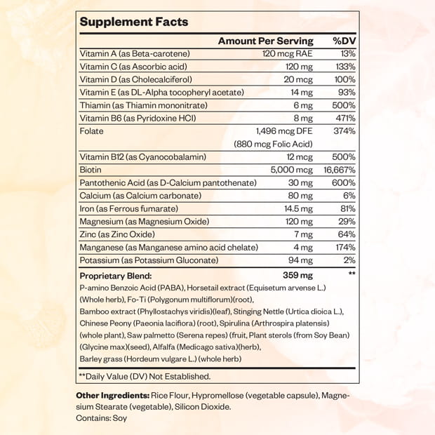 This formulation combines essential micronutrients such as Vitamin A, Vitamin C, Vitamin D, Vitamin E, Biotin, and Folate, alongside minerals including Zinc, Magnesium, and Iron. It also incorporates botanical extracts like Horsetail, Bamboo, Nettle, and Saw Palmetto, creating a comprehensive composition tailored for beauty-focused supplement lines.