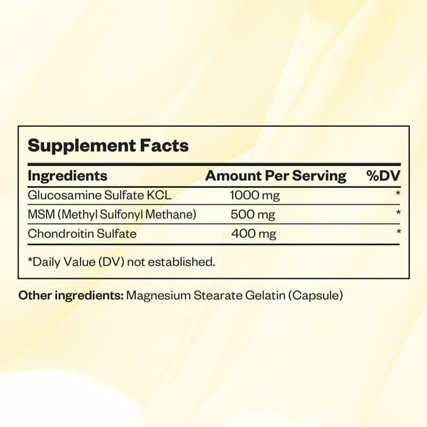 The formula combines Glucosamine, MSM, and Chondroitin, three ingredients widely used in supplements designed to support joint mobility and connective tissue health.