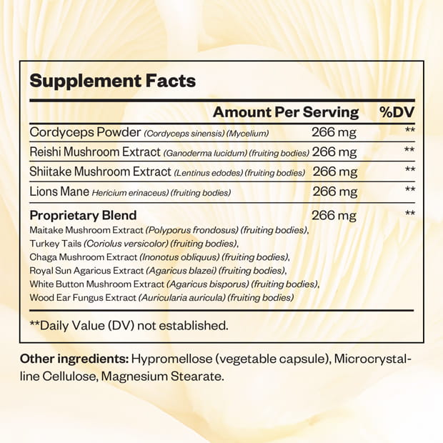 This formulation combines a wide range of mushroom sources including Cordyceps, Reishi, Shiitake, and Lion’s Mane, alongside additional components such as Maitake, Turkey Tail, Chaga, Agaricus, and other complementary fungi extracts. Encapsulated using Hypromellose with standard excipients, this blend enables brands to develop supplements designed for comprehensive wellness support.