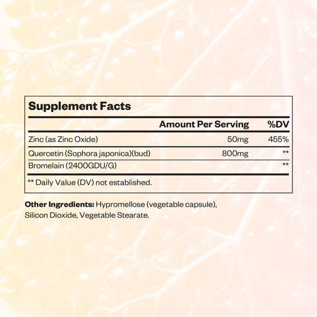 This formulation features a combination of Quercetin derived from Sophora Japonica alongside supportive compounds such as Zinc and enzymatic elements like Bromelain. It also includes capsule delivery components such as Hypromellose and stabilizing agents, creating a targeted composition for immune and antioxidant-focused product positioning.