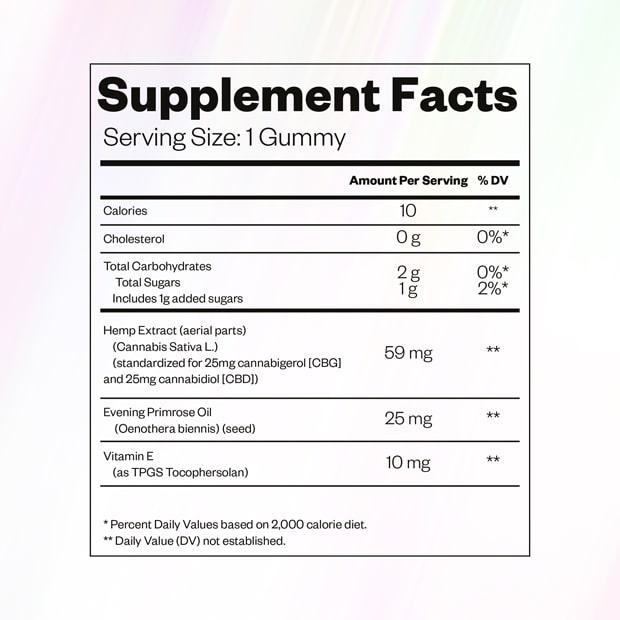 These gummies are formulated with a synergistic blend of botanical extracts, adaptogens and essential nutrients like Primerose Oil and Vitamin E, that help regulate mood and reduce stress. Each ingredient is selected to support calmness, focus, and emotional balance without causing drowsiness.