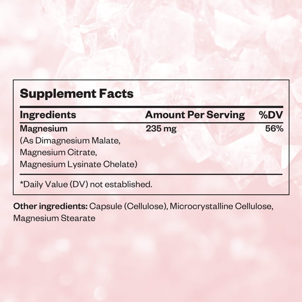 The formula combines multiple magnesium forms including Dimagnesium Malate, Magnesium Citrate, and Magnesium Lysinate Chelate, each selected for its bioavailability profile. This multi-source approach helps support efficient mineral utilization and consistent magnesium delivery within daily wellness supplementation.