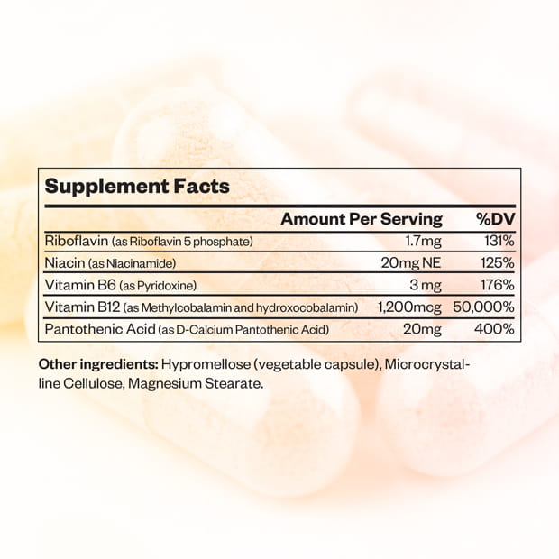 This formulation includes a combination of B vitamins such as Riboflavin, Niacinamide, Pyridoxine, and high potency Vitamin B12 in both methylcobalamin and hydroxocobalamin forms. It is complemented by Pantothenic Acid and a liquid base composed of purified water, Glycerin, and natural flavor components, allowing for a balanced and consumer friendly supplement experience.